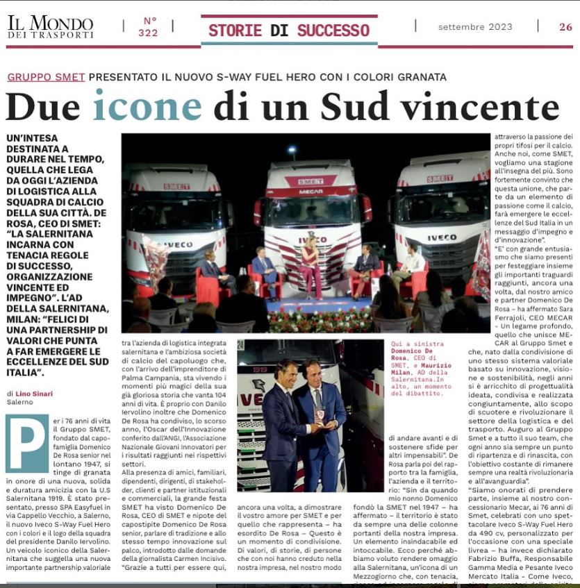 Settantasei anni da festeggiare, 76 anni di traguardi raggiunti, 76 anni in cui la storia e il futuro si incrociano, regalando al mondo della logistica e del trasporto uno dei più grandi player che fanno la differenza e, affianco al Gruppo SMET, a celebrare tutto questo, da un lato c’è Mecar, partner storico del gruppo e, dall’altro i colori granata dell’U.S Salernitana 1919.