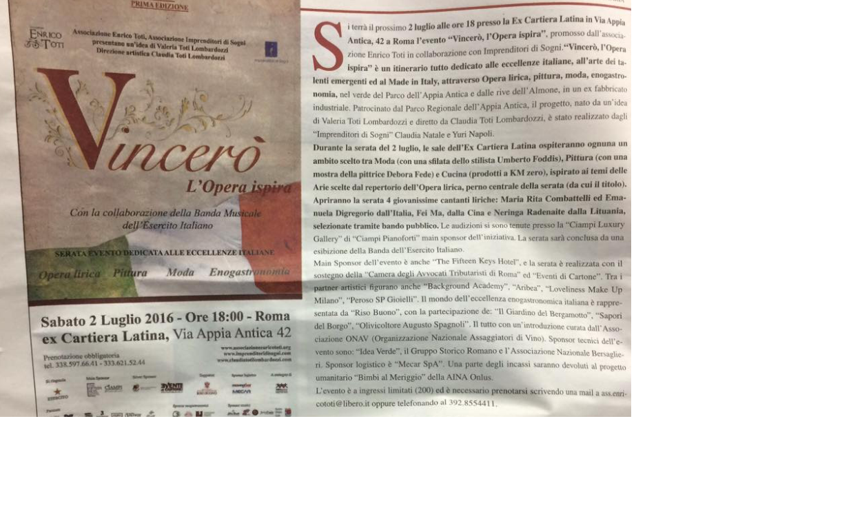 L’evento tenutosi a Roma, sabato 2 luglio, presso la Ex Cartiera Latina in Via Appia Antica, 42 a Roma, promosso dall’Associazione Enrico Toti, è stato un vero successo. La formula poliedrica non poteva fallire: si trattava di un itinerario tutto dedicato alle eccellenze italiane, all’arte dei talenti emergenti e al Made in Italy, attraverso l’Opera lirica, la pittura, la moda, l’enogastronomia, in una magnifica cornice verde, quella del Parco dell’Appia Antica e delle rive dell’Almone, nella location di un ex fabbricato industriale risorto a nuova vita culturale. Patrocinato dal Parco Regionale dell’Appia Antica, il Progetto, nato da un’idea di Valeria Toti Lombardozzi e diretto da Claudia Toti Lombardozzi, è stato realizzato dagli “Imprenditori di Sogni” Claudia Natale e Yuri Napoli.